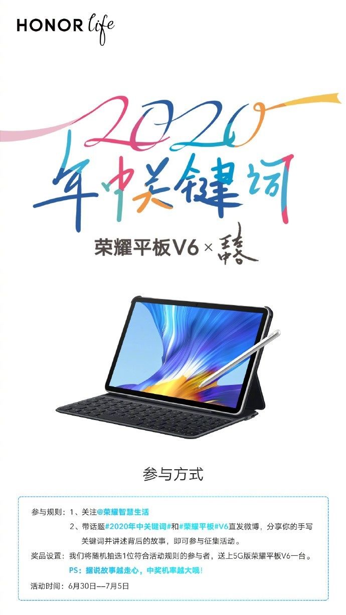 6 月 30 日,荣耀平板 V6 联合文字玩咖王左中右,在荣耀智慧生活官微发起「2020 年中关键词」征集活动,邀请网友以手写字的形式晒出关键词,并分享背后的精彩故事,在网络引发强烈反响。