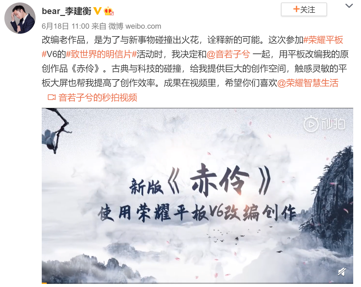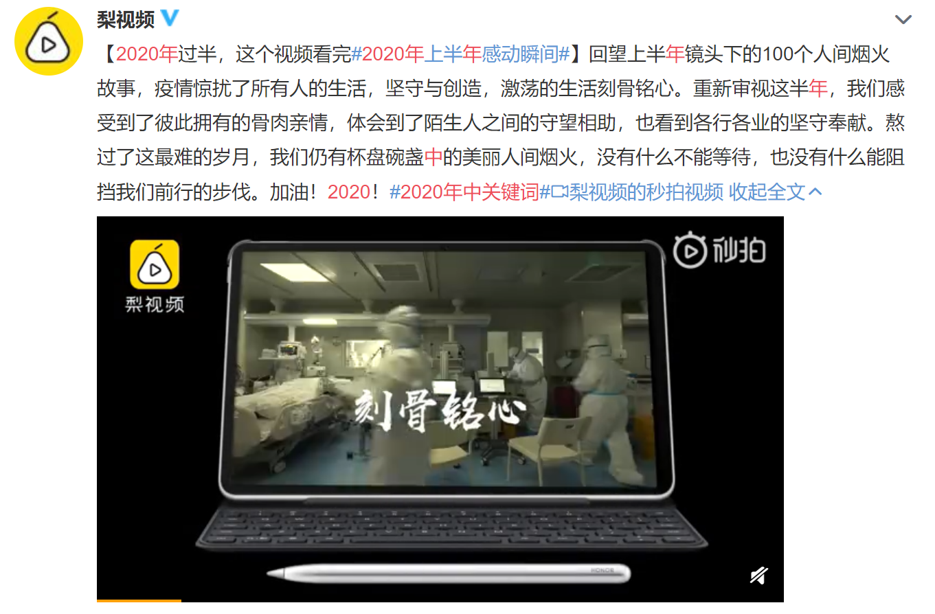 7 月 1 日,梨视频率先发布 #2020 年上半年感动瞬间 # 的混剪视频。视频中,王左中右借助荣耀平板 V6 和荣耀 Magic-Pencil 创作了 2020 年中关键词——「创造」,充分展示了科技对创造力的助推作用。