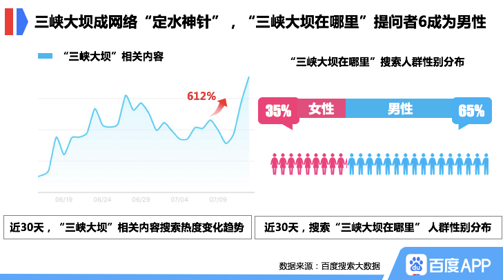据水利专家介绍,在本次抗洪防汛工作中,三峡大坝起到了重要作用,为长江中下游减轻了水位压力。近30天内,“三峡大坝”相关内容搜索热度暴涨612%,远超其他水利工程。但百度搜索大数据显示,三峡大坝相关知识仍处在部分网友的“待科普区”,“三峡大坝在哪里”的搜索热度大涨,提问者超6成为男性。