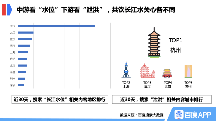 受灾最严重的长江流域网友,其搜索兴趣受防汛工作重点的影响呈现出不同。百度搜索大数据显示,武汉、九江等长江中游城市网友更爱搜索“长江水位”, 或因长江水位不断上涨令其担忧。而长江下游的浙江、上海其水位仍有余裕,为保护大坝多个水库进行开闸泄洪,当地网友则对“泄洪”相关内容表现出更强的搜索兴趣。