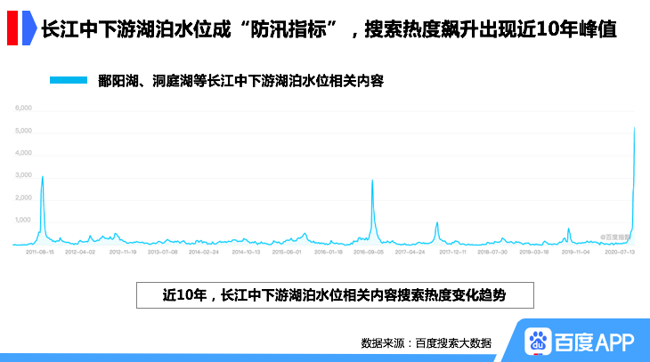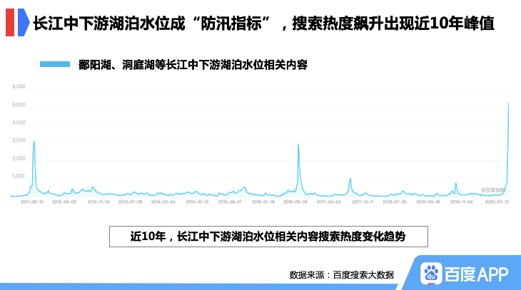 2020年汛期以来,南方多地接连发生洪涝灾害,7月12日水利部将水旱灾害防御Ⅲ级应急响应提升至Ⅱ级,同日鄱阳湖水位突破1998年历史极值。日益严峻的防洪形势令全民牵挂,长江中下游各大湖泊的水位成为网民心目中的“防汛指标”,百度搜索大数据显示,鄱阳湖、洞庭湖等长江中下游湖泊水位搜索热度飙升,出现近10年的搜索峰值。