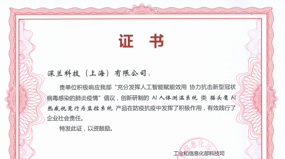深兰科技作为“新基建”在AI领域的技术代表,因积极研发猫头鹰测温系统在内的抗疫防疫产品,并将相关解决方案及智能化产品服务武汉、上海、北京等多地的抗疫防疫工作,还特别收到工信部发来的证书奖章。