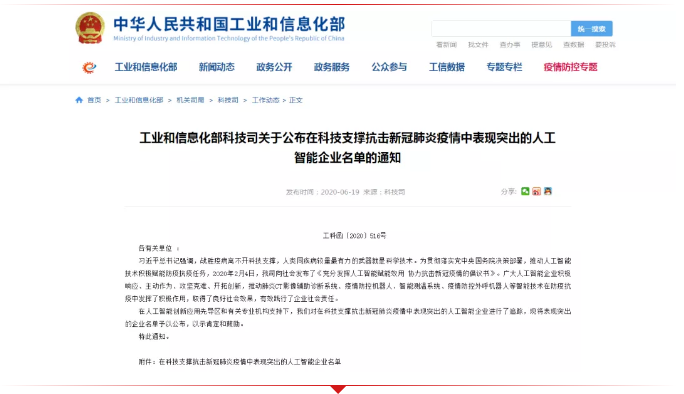 近日,工业和信息化部科技司发布了《在科技支撑抗击新冠肺炎疫情中表现突出的人工智能企业名单》,阿里云、百度、京东、腾讯、深兰科技等知名企业均上榜单。