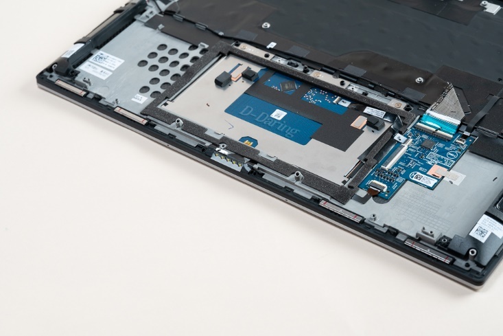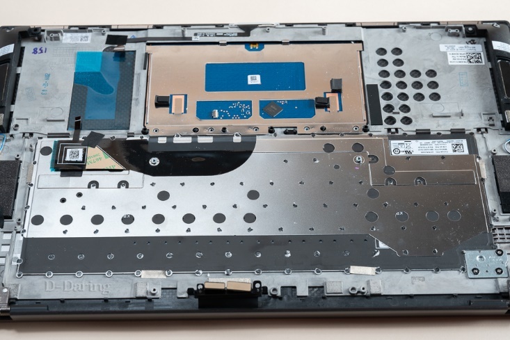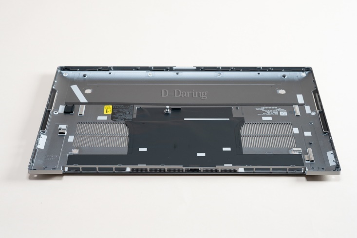 已除电池以及内存、硬盘模块后,果然还有大半斤重的镁合金大板藏在下面,这个和5550很相似,极大增强了机器的掌托结构强度,这也是机身刚度优秀的重要原因。