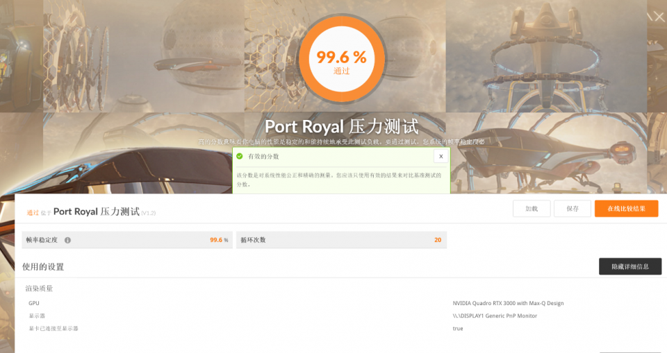 桌面温度25到27(电脑左右两边),后部脚垫垫高一个手机厚度,跑一下3Dmark的几个压力测试,分别循环20次,过的很轻松