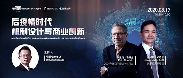 8月17日,腾讯研究院和腾讯新闻联合主办的“腾讯对话·Tencent Dialogue:始于2020”举行了第三期线上对谈。诺贝尔经济学奖得主、哈佛大学教授埃里克·马斯金(Eric Maskin)与腾讯首席战略官兼高级执行副总裁詹姆斯·米切尔(James Mitchell)围绕“后疫情时代中的机制设计与新商业环境”,通过腾讯会议展开“云对话”,对话由腾讯研究院首席研究员李刚担任主持人。