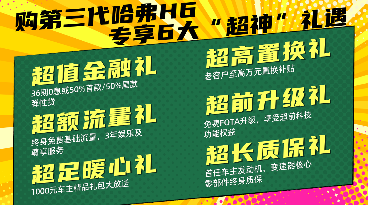 设计进化——历经 3 代光华流转的荣耀沉淀,第三代哈弗 H6 拥有与生俱来的强大气场与王者风范;东方式未来美学设计语言,更经典、更耐看,激动人心的外观线条也将强劲的动感力量彰显无遗,同时,内饰采的超感未来智慧座舱设计,更带来焕然一新的感官享受。智能进化——上千项智能升级,集智慧黑科技于一身,不仅具备整车 FOTA 升级,还支持超 L2 级自动驾驶,拥有全场景 AEB 自动紧急制动、50 米全自动循迹倒车、智慧躲闪等 22 项智能驾驶辅助功能。动力进化——搭载 1.5 GDIT EVO 发动机,最大扭矩输出范围扩大至 1400-3600rpm,并匹配第二代 7DCT 变速器,综合传动效率高达 95.6%,带来更加澎湃自如的驾控体验。安全进化——提出「安全不分级」的理念,标配 71.61% 高强度钢车身、热成型钢一体式门框和 6 个安全气囊,且热成型刚强度高达 2000Mpa,领先同级 SUV,面临危险亦能从容应对。舒适进化——远程座椅加热、前排无线充电、AQS 空气管理系统等,打造舒适豪华的驾乘体验。