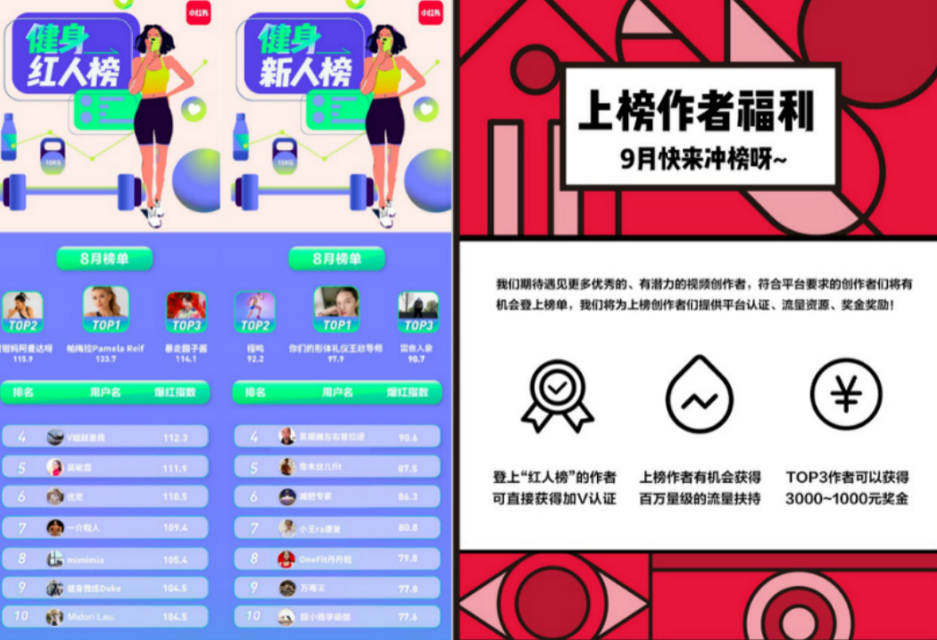 8 月 31 日,小红书发布 8 月健身创作者荣誉榜,以当月涨粉量、粉丝互动量、视频播放量为核心指标进行排序,选出了最受用户欢迎的 10 位「红人」和 10 位「新人」。国际健身博主帕梅榜拉居红人榜首,奥运冠军吴敏霞来到小红书刚满 3 个月,就位居红人榜第五。