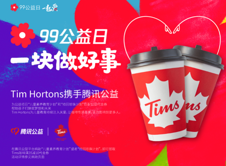 Tims 咖啡为鼓励更多消费者积极加入到腾讯 99 公益日、引领人人公益的潮流,从 9 月 7 日起,在腾讯公益平台捐助「儿童素养教育计划」和「捡回珍珠计划」,即可领取 Tims 公益代金券,以日常一杯小美好传递关爱、传递善意。