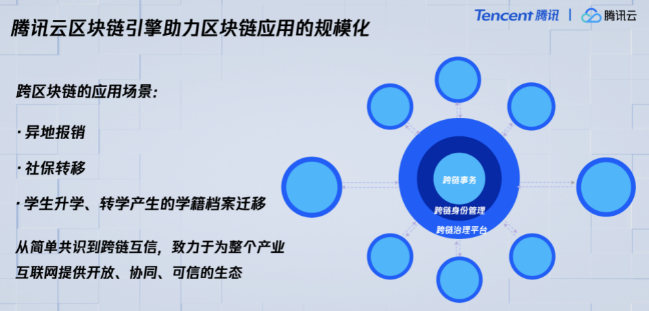 其中,腾讯云区块链底层引擎是一个具有高可扩展性的企业区块链系统,主要解决产业区块链应用数据量过大带来的扩展性问题,以及区块链之间的跨链互操作问题,以实现更大规模跨组织的信息化协作。