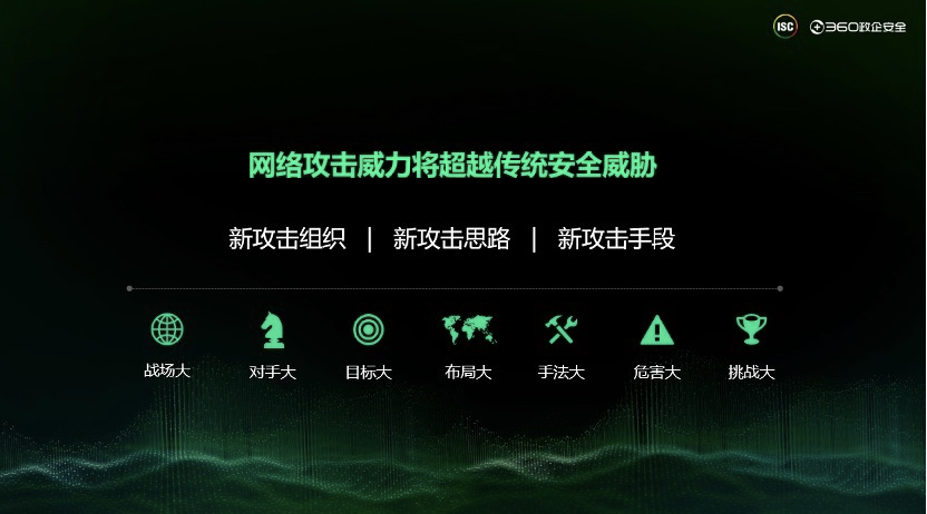 「与传统威胁相比,还要面对新的攻击组织、新的攻击思路、新的攻击手段。我们将这种新的态势总结为『七个大』,即战场大、对手大、目标大、布局大、手法大、危害大和挑战大。「姚彤在发布会上如是说到。