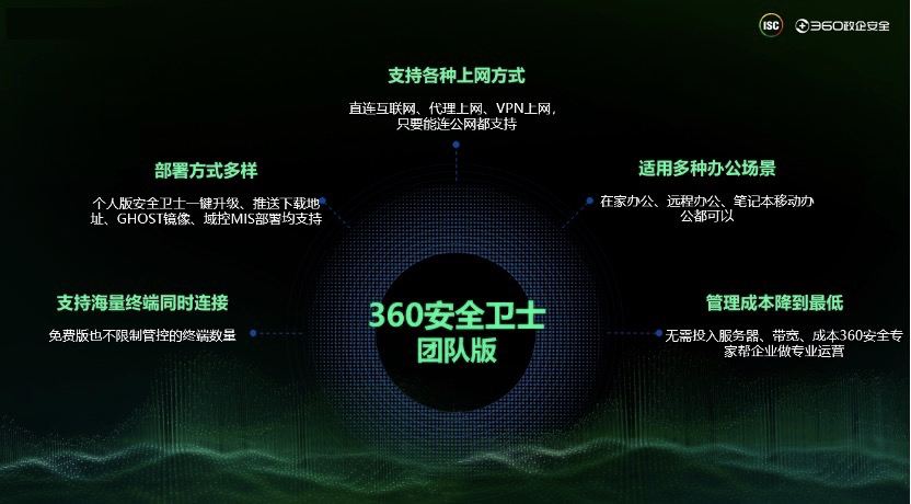 小微企业是国民经济和社会发展的重要基础,但网络木马、病毒、恶意软件肆虐,企业敏感信息泄漏、业务数据丢失等终端安全隐患却不断爆发。360 安全卫士团队版重点面向小微企业,由 360 提供云服务器,具有支持海量终端同时连接、支持多种部署方式、支持多种联网方式、适合多种政企办公场景和管理成本低这五大亮点。360 安全卫士团队版提供了多方面的管理功能,此次升级更为突出的是提供安全管理和资产管理两大功能。