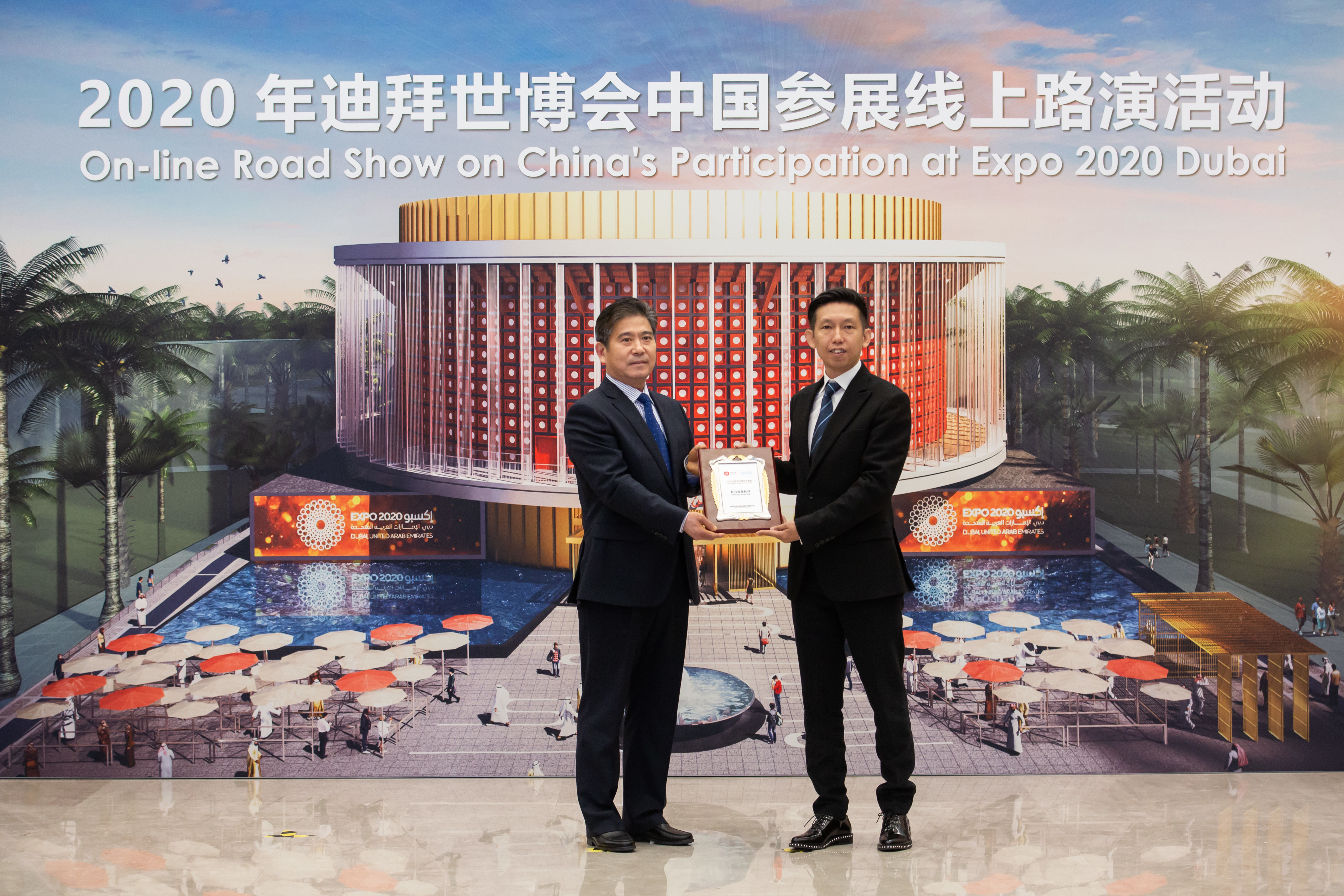 10 月 20 日下午,迪拜世博会中国参展线上路演和授牌仪式在北京中国贸促会举行。