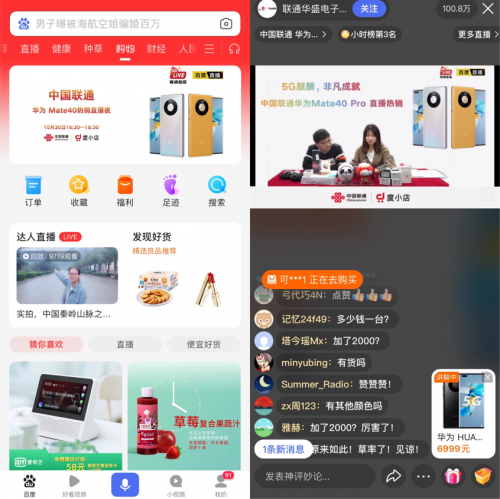 10月30日,备受期待的华为Mate 40系列国行版开售,起售价4999元。天猫、京东、百度等电商平台同步发售。当天,百度度小店与中国联通联合举办华为Mate 40热销直播夜,不少用户在百度App购物频道“蹲守”直播间,华为Mate 40系列新品一经上架即被“秒光“。