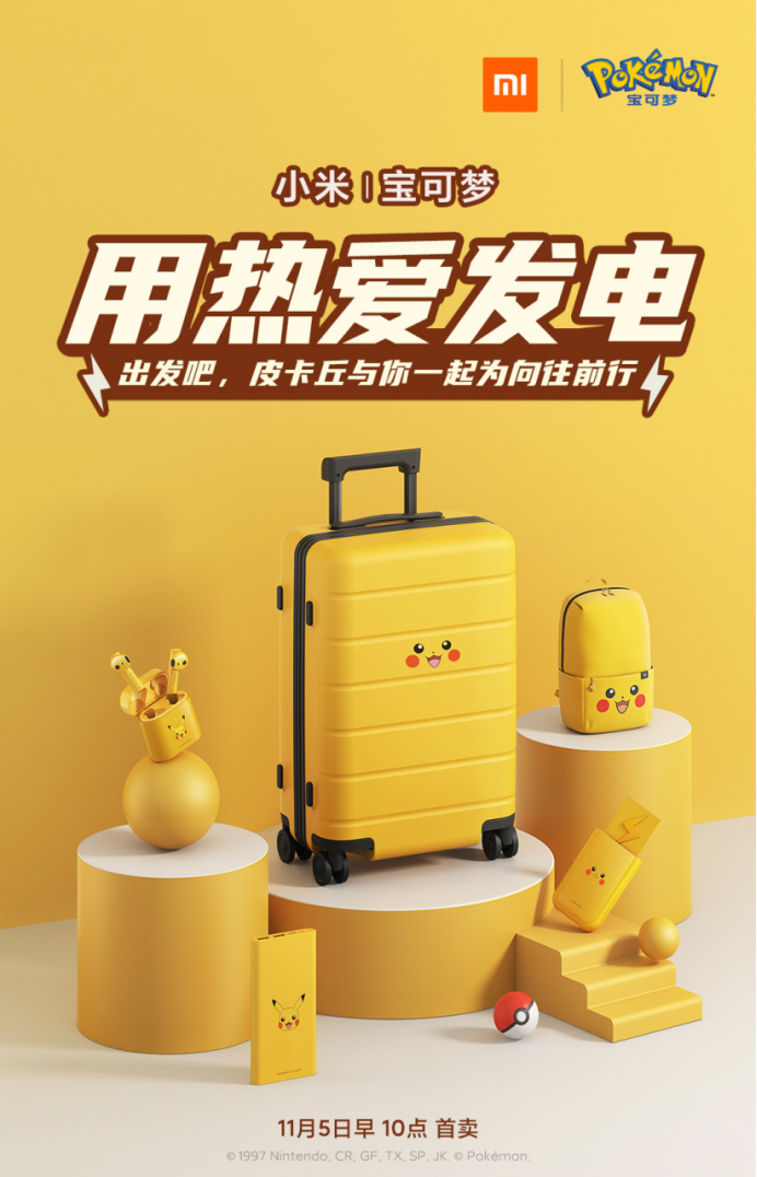 北京时间 2020 年 11 月 5 日,小米正式发布与《宝可梦》一同推出 5 款联名款产品,包括小米旅行箱 20 英寸皮卡丘定制款,售价 399 元;小米口袋照片打印机皮卡丘定制款,售价 399 元;小米小背包 10L 皮卡丘定制款,售价 59 元;小米移动电源 3 10000mAh 皮卡丘快充版定制款,售价 99 元;小米真无线蓝牙耳机 Air 2s 皮卡丘定制款,售价 399 元,所有产品将于 11 月 5 日正式开售。