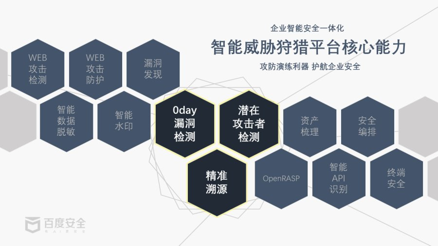 依托全流量分析技术、异常检测模型和智能算法,百度安全智能威胁狩猎平台融合了 WAF、IDS、EDR 等安全功能,同时引入了包括智能标记技术、UEBA 潜在攻击者检测、业务建模、智能溯源在内的一系列 AI 安全能力。为应对上述分散繁杂且更具威胁性的安全挑战及攻防演练需求提供了智能一体化的安全解决方案,实现了对于安全威胁的快速检测和响应,提升了工作效率,降低了人力成本。