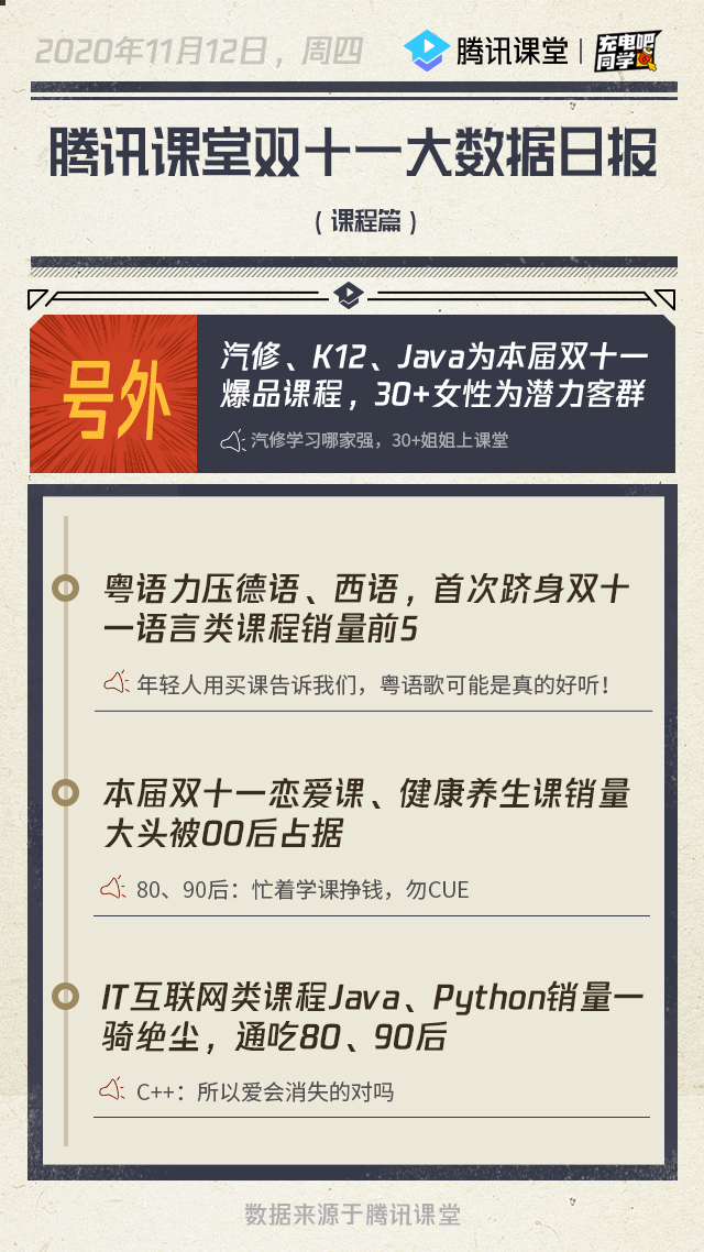 汽修、恋爱、养生健康甚至是粤语,都成为了腾讯课堂双十一期间的热卖网课。多元化网课购买趋势呼之欲出。