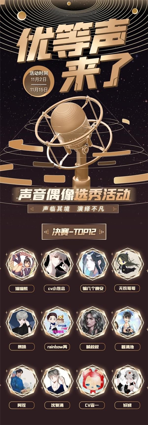 一直以来,克拉克拉致力于为声优主播提供更好的发展平台,发挥平台优势,整合资源,先后推出各类大赛活动进行直播赛事化,激励主播成长,推出“超级豆咖”主播成长体系进行重磅运营,打造王牌直播栏目“克拉团建趴”加强主播曝光。通过系列优质内容链接更多用户从而实现平台优质主播的跨越式成长。相信通过此次《优等声来了》活动,作为国内第一声优直播互动平台的克拉克拉,可以为声优主播们提供一个施展才华的舞台,让他们凭借自身的声音优势让更多的人感受声音的魅力,助力优质的主播发展成为优质的声音偶像。12强选手角逐冠军,谁能冲出重围夺得冠军大奖呢?接下来,让我们一起期待《优等声来了》决赛夜,一起见证声音偶像的诞生!