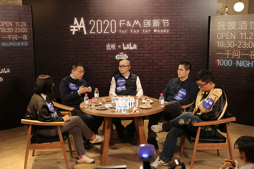 等到正式开始后,在故意设计得略显幽暗和昏黄的灯光环境下,抚摸酒馆的第一批客人陆续落座,一看,全是老面孔——新物种实验室计划发起人、被戏称为互联网思想家的吴声,虎嗅年度作者、虎嗅直播常驻嘉宾、「花儿街参考」创始人林默,去年来过虎嗅 N Live 的前魅族副总裁、恕瞄科技创始人李楠,以及虎嗅前同事、现 B 站 UP 主老蒋巨靠谱。
