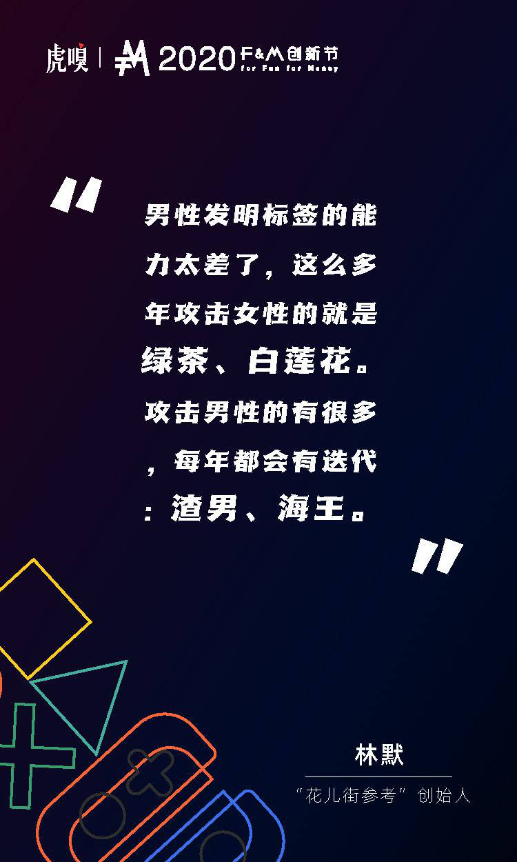 林默:性别话题我肯定觉得是没有被过度讨论,我只是觉得这些讨论没有去到应该去的地儿,我也不觉得标签是没有意义的,关键是男性发明标签的能力太差了,这么多年攻击女性的就是绿茶、白莲花。攻击男性的有很多,每年都会有迭代,渣男、海王。