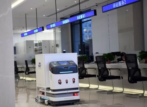 法院日常工作需要大量的卷宗运送流转。传统工作场景下,工作人员需要自己抱着大批卷宗,或者推着小推车频繁往返,容易出现文件散落等意外,涉密文件一旦遗落,后果难以想象。如今,京东数科为三中院提供了室内卷宗运送机器人,能够自动往返于立案窗口和材料收转窗口之间,大大降低了人员运送卷宗的工作负担,同时通过卷宗柜上设密码锁等方式保证卷宗取送安全。