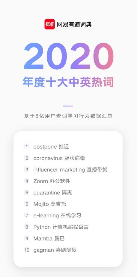网易有道词典已经连续第九年推出年度热词榜单。用户在网易有道词典内的每一次搜索和查询,都在创造自己的年度热词。被postpone(推迟)的2020年让每个人滋味不尽相同,但也成为让快速奔跑的人们停下来反思的一年。