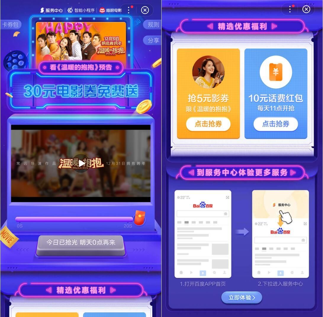 猫眼在与百度智能小程序的联合宣发中将自己的院线资源通过猫眼智能小程序接入百度生态获取精准流量;百度则通过打通内部全场景流量,联动百度APP、百家号、智能小程序、百度地图、百度贴吧全矩阵产品进行推广。年末《温暖的抱抱》便融入到百度智能小程序服务中心夜市狂欢节活动中,作为观影消费场景下的重要一环参与了聚合推广,并为用户送上30元观影券的重磅福利。