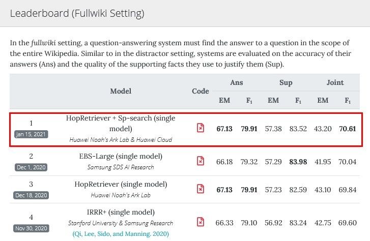 华为云联合华为诺亚方舟实验室,提出了新的检索目标hop,用于收集维基百科中隐藏的推理证据,解决复杂多跳问题,同时结合beam search对答案进行排序和融合。