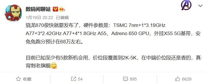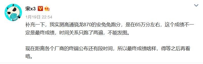 关于骁龙870的性能表现,此前已经有多位数码博主进行了爆料,@数码闲聊站称这颗芯片安兔兔跑分预计在68万左右(手机整体得分),另一位数码博主@宋x3实际测试的分数在65万分左右。不过后者也表示,这个成绩不是最终成绩,想来是因为工程机的缘故,跑分成绩最后还会得到提升。