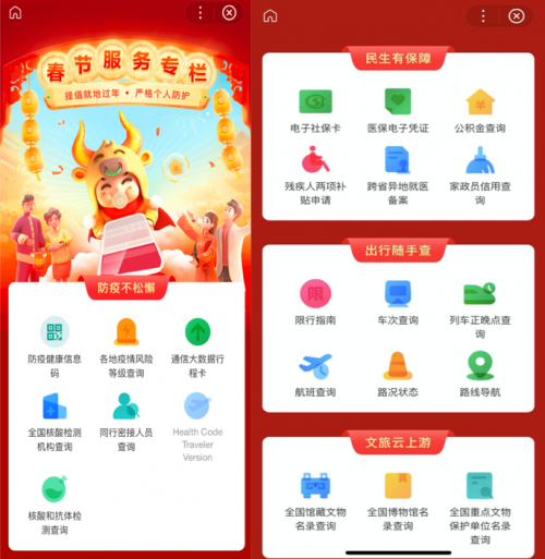 在百度App上搜索“国家政务服务平台”进入国家政务服务平台百度智能小程序首页“春节服务专栏“专区,即可享受春节专项服务。“春节服务专栏”囊括“防疫不松懈”、“民生有保障”、“出行随手查”、“文旅云上游”四大服务板块,多种疫情防控相关功能统统聚合到一个页面内,不仅简化了操作流程,也为用户提供了出行前、出行途中以及抵乡后等全场景解决方案,全面助力用户春节安全返乡。