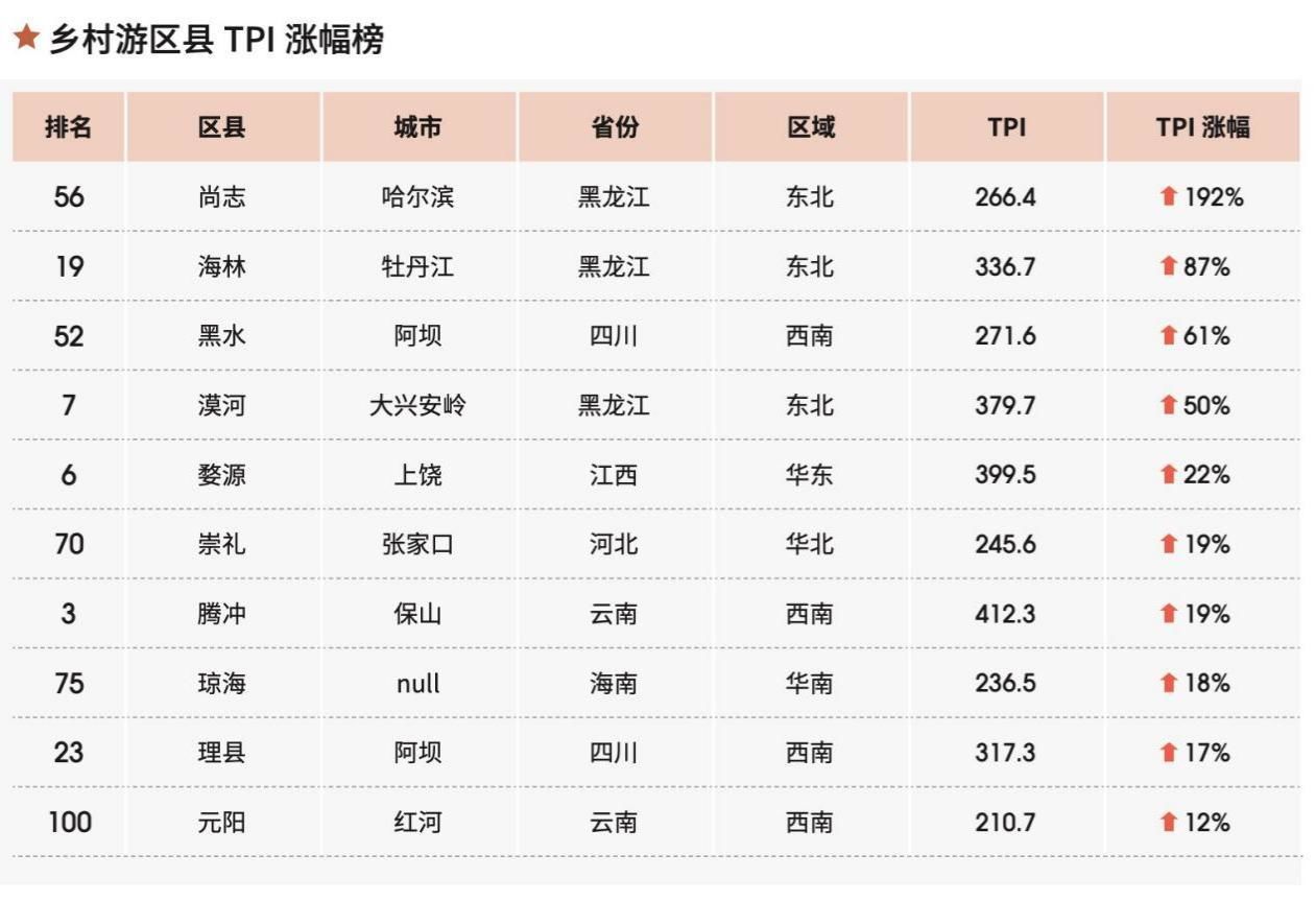 报告显示,2020 年 10 月至 12 月,TPI 指数排名前 100 的乡村游区县中,哈尔滨尚志,牡丹江海林和阿坝黑水的 TPI 指数涨幅位列前 3 名。在尚志,亚布力滑雪旅游度假区和新体委滑雪场不仅可以让游客体验滑雪的乐趣,还有温泉度假和众多特色冰雪体验项目供游客选择,丰富的冰雪项目带动了尚志秋冬季节的 TPI 指数上涨。先后入围马蜂窝「中国新秘境」和「冬季新秘境」的达古冰川位于四川阿坝黑水县,也在秋冬季节迎来了大批游客,让黑水的 TPI 指数增长迅速。