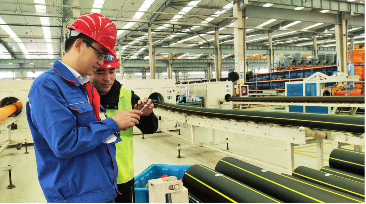塑料管道车间的工人使用黑湖智造协同作业