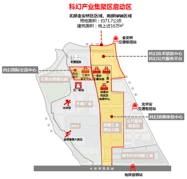 科幻产业集聚区启动区以首钢园区(北区)的中心片区——工业遗址公园为主要承载区,包括金安桥和南部绿轴区域,占地面积71.7公顷,建筑面积近16万平方米。