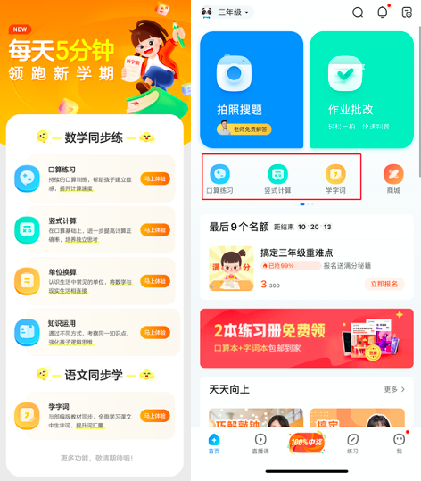 针对小学三年级孩子所面临的问题,中国最大的在线教育公司作业帮旗下产品作业帮APP,在近日面向小学1-3年级家长和学生们上线了“数学同步练”与“语文同步学”课后练习功能,与学校教学进度同步,进行单个技能的专项练习,巩固掌握基础知识,让孩子在练习中也能体验到学习的乐趣,每天5分钟轻松解决语文数学难点。