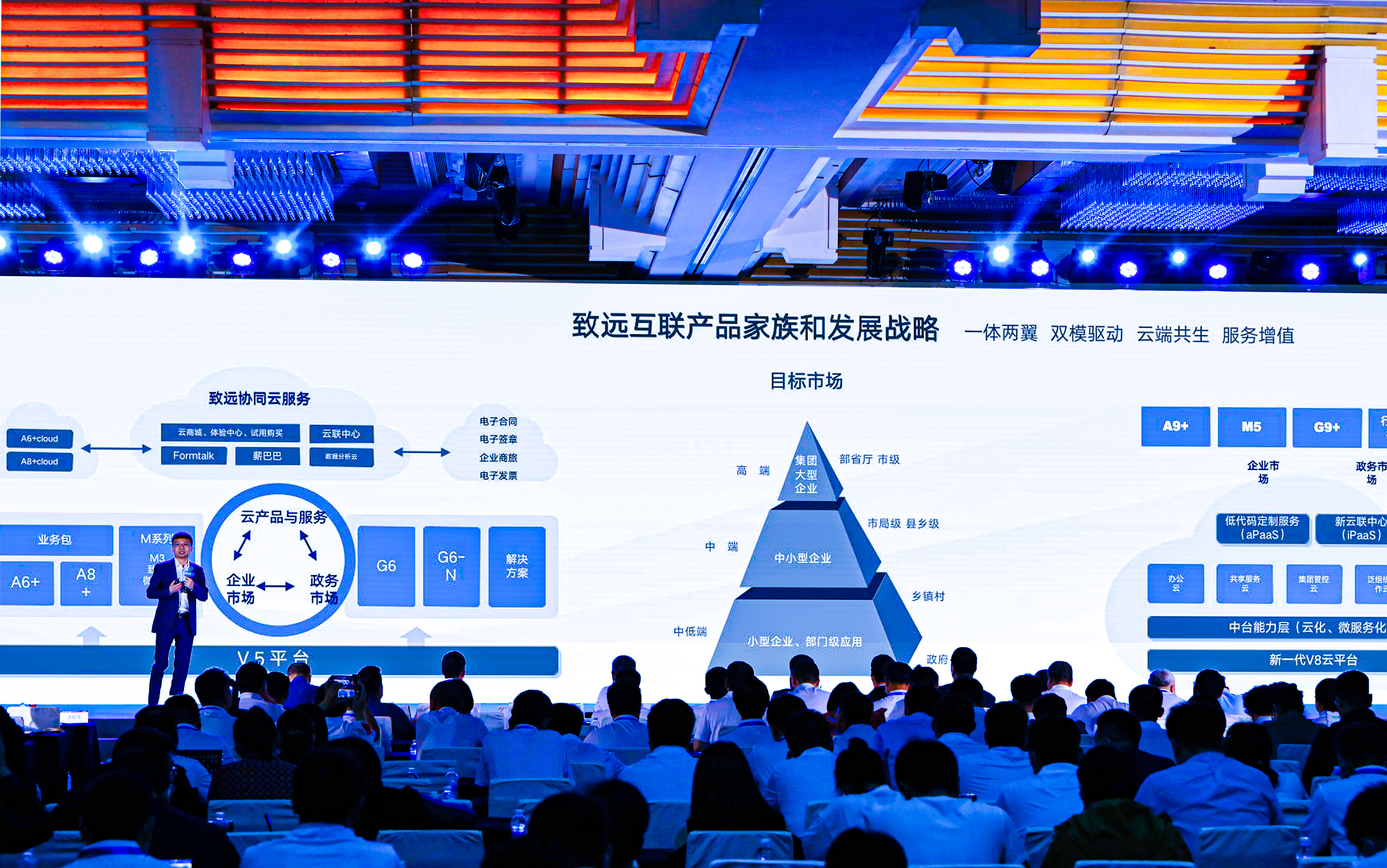 产品作为致远互联的立命之本,亦是伙伴持续经营客户的载体。随着技术日益成熟和企业数字化需求的逐渐深入,协同管理也朝着全员移动化、IT 云化、业务中台化、决策数据化、服务社会化五化方向发展。会上,致远互联副总裁、研发体系总经理谭敏锋携 V5 平台、在线服务、全新一代 V8 协同云,以及薪事力 DHR 人力云、政务协同平台&全栈解决方案悉数亮相,通过提供覆盖私有云、公有云、混合云的全域协同管理平台及云服务,共同构建起 COP 强大的中台力量,全面支撑伙伴经营升级,持续创造客户价值。