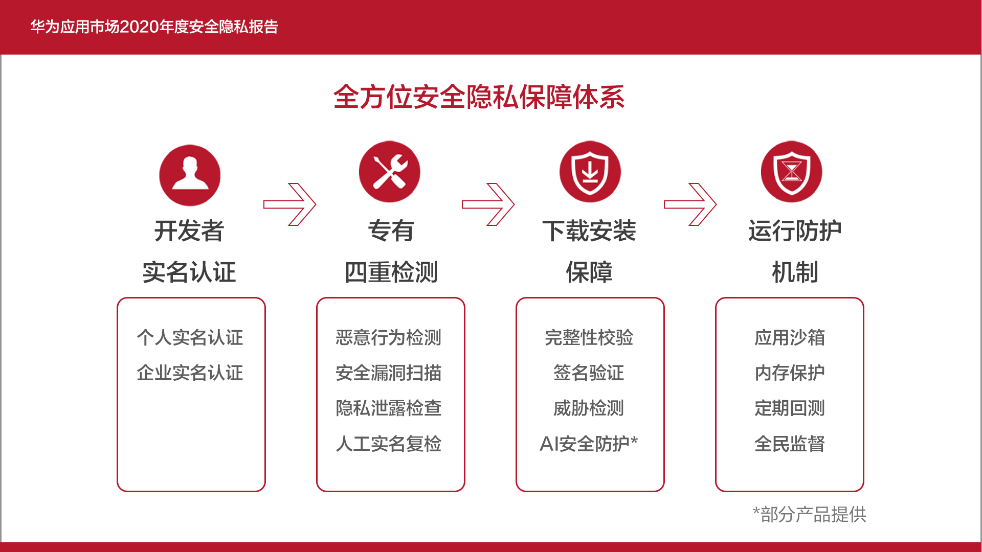 报告显示,华为应用市场“全方位安全隐私保障体系”贯穿应用上架、下载、安装、使用等全流程。其中,应用上架前开发者需实名认证,以保证应用问题可追溯。应用上架时,“专有四重检测机制”可对应用进行恶意行为、安全漏洞、隐私泄露、人工实名等检测,评估上架应用质量。