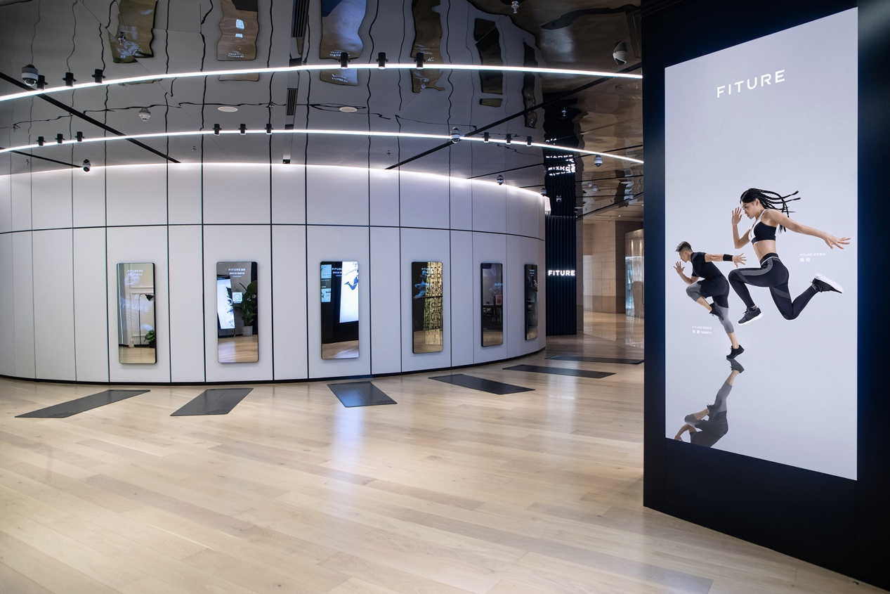 (FITURE 明星教练佩悦 (中)、Happy(右)、Andy(左))FITURE 北京国贸旗舰店是 FITURE 全球首家旗舰店,也是智能健身镜领域的首家线下⻔店,其设计开创了诸多先例,彰显了这家科技健身公司全面布局线下的战略起航。