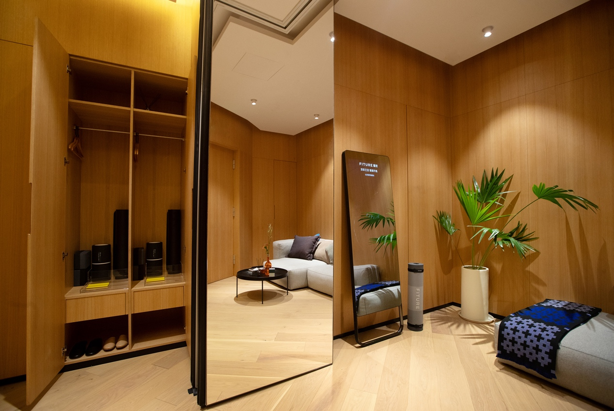 在用户体验区,FITURE 魔镜围绕着一个外弧形墙面入嵌式排列,意在给每个顾客更多的体验空间。考虑到北京的气候及人们穿外套的习惯,每台 FITURE 魔镜边上都有个独立的收纳柜,甚至柜体的设计都有考虑到收纳靴子的空间,让体验的顾客更方便地收纳自己的衣物。同时柜子里还配备了智能运动手表,方便顾客体验时查看心率。