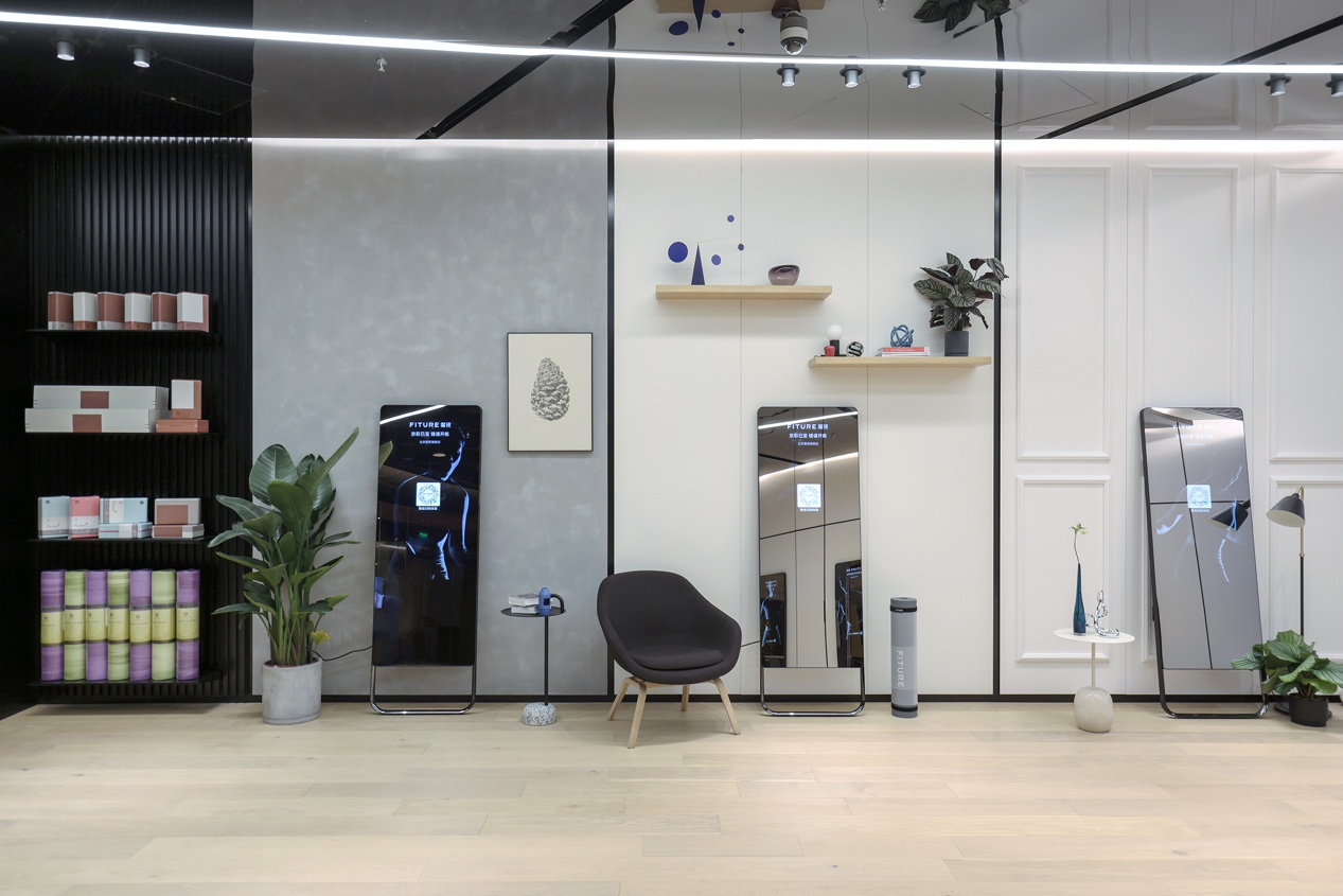 FITURE 魔镜是一款追求极致的工业设计的产品,不论放在什么⻛格的家装、商务环境里,都能彰显 出它不凡的格调。在 FITURE 北京国贸旗舰店的入口处,呈现有三种家装⻛格,分别是时尚休闲、温 馨家居和品质商务,让顾客能够直观地感受到将产品放置于不同的场景中呈现出的效果。