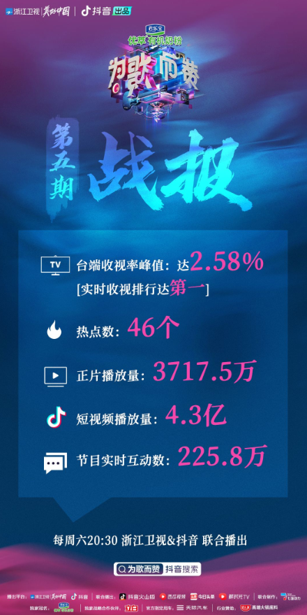 第五期《为歌而赞》可谓高手如云,不仅有“国宝级”的歌唱家廖康永亲临节目开唱新歌,还有实力唱将胡彦斌、张碧晨强势加盟,新生代创作者小鬼、裘德和太一等新面孔的加入。《为歌而赞》始终保持着热度,获得了许多观众的喜爱。根据数据统计,第五期《为歌而赞》台端收视率峰值达2.58%,实时收视排行第一,全网热点收割46个,正片播放量达3717.5万,短视频播放量高达4.3亿,大小屏互动的创新玩法也让节目实时互动数达到225.8万。