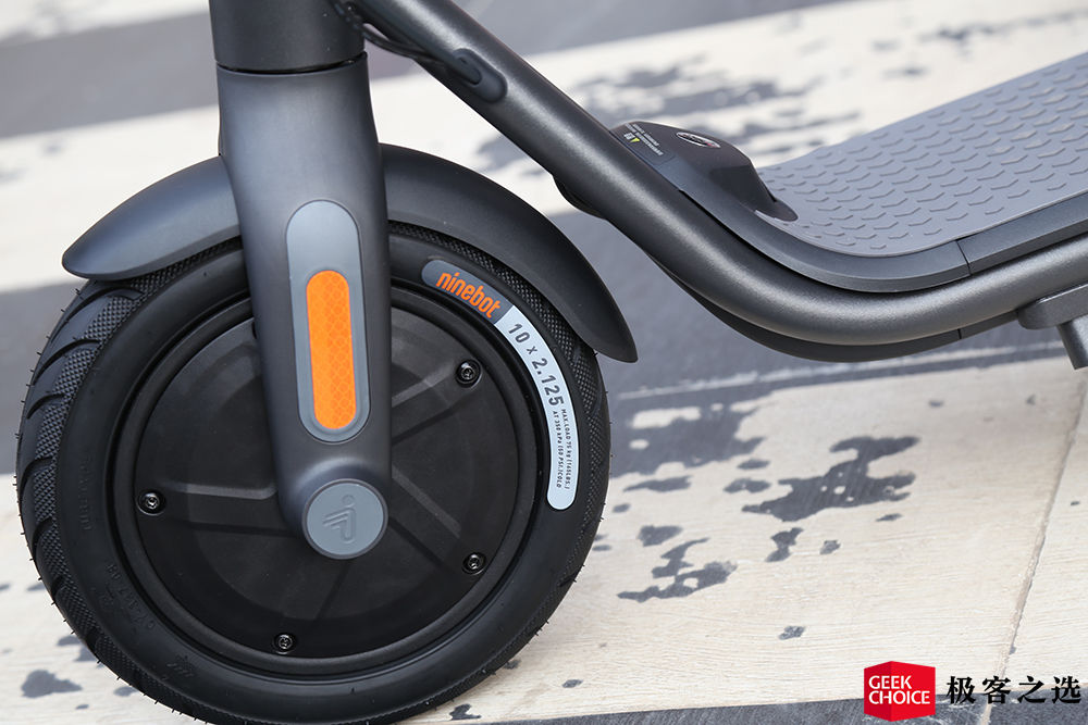 在轮胎方面,九号电动滑板车 F25 采用的 10×2.125 规格的轮胎,从花纹上来看,这套轮胎在湿滑地面的防滑能力还是不错的。另一方面,它是采用了外胎+充气内胎的组合方式,前轮是电机,后轮则配备了碟刹,刹车盘的尺寸更大,也配备了 E-ABS 电子防抱死系统,在制动方面的表现不用担心。