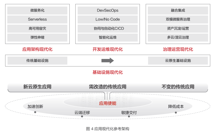 应用敏捷方面,华为基于服务数百万企业客户的经验沉淀,以及结合自身30 年的数字化实践总结,提出“基础设施现代化、应用架构现代化、开发运维现代化、治理运营现代化”这四个现代化是企业走向应用现代化的关键,让企业走上以业务和应用为中心的敏捷道路,重塑应用的商业价值。