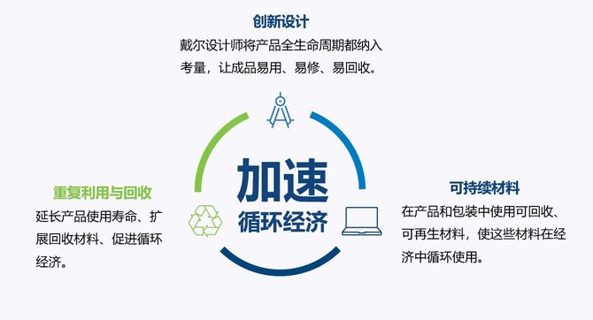 在全球,有至少数百万人在使用戴尔的产品。对戴尔而言,这是一份荣耀,更是一份责任,推动着戴尔的设计师和工程师们不断努力、研发出更利于循环经济的产品。 为此,戴尔给自己设立了一个宏伟的目标:到2030年,实现客户每购买一件产品都回收一件与之相当的产品;所有的产品包装和一半以上的产品原料来源于回收或可再生材料,实现真正意义上的“循环经济”。