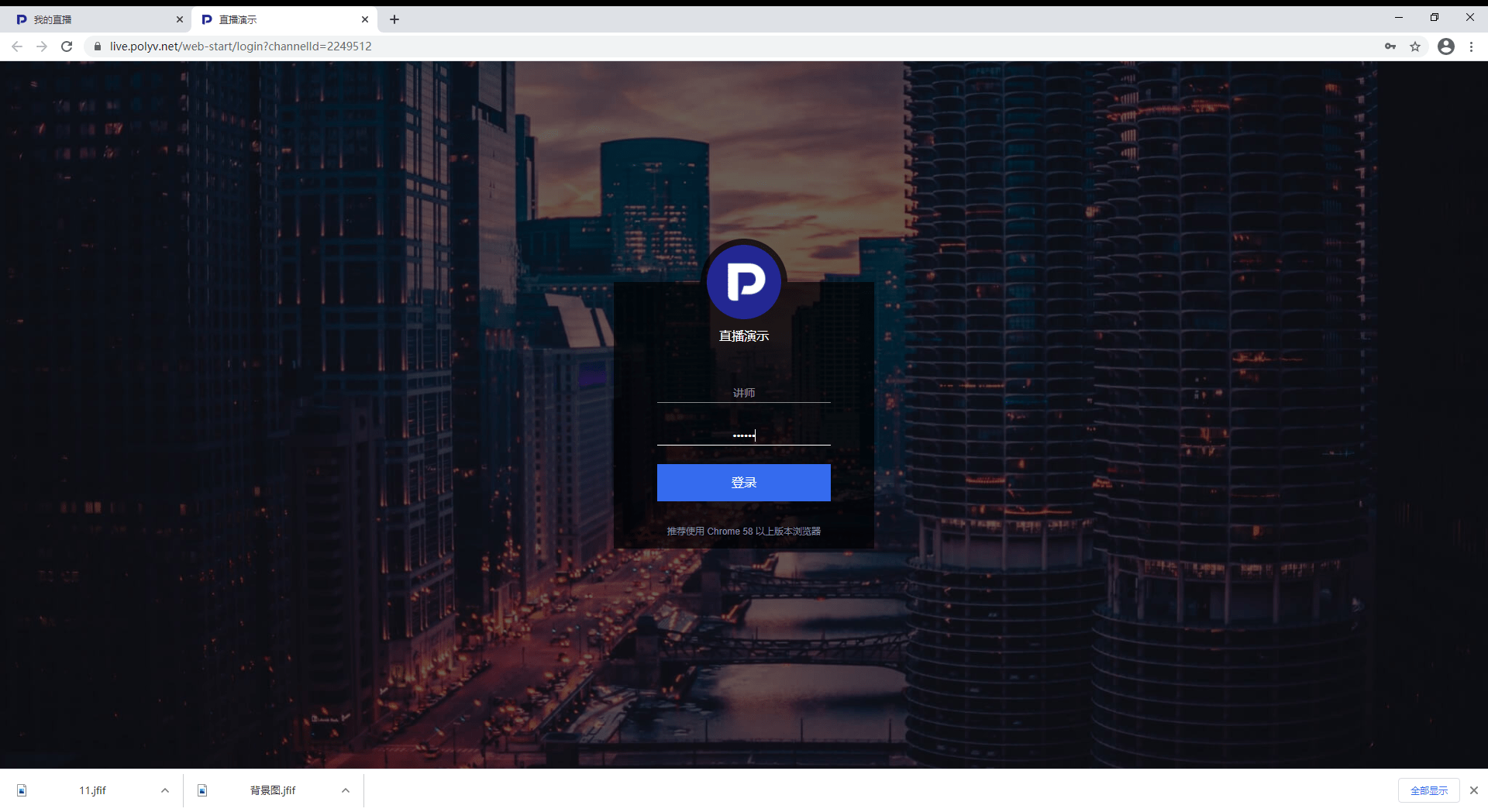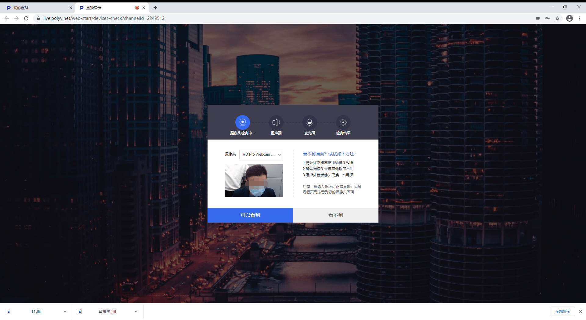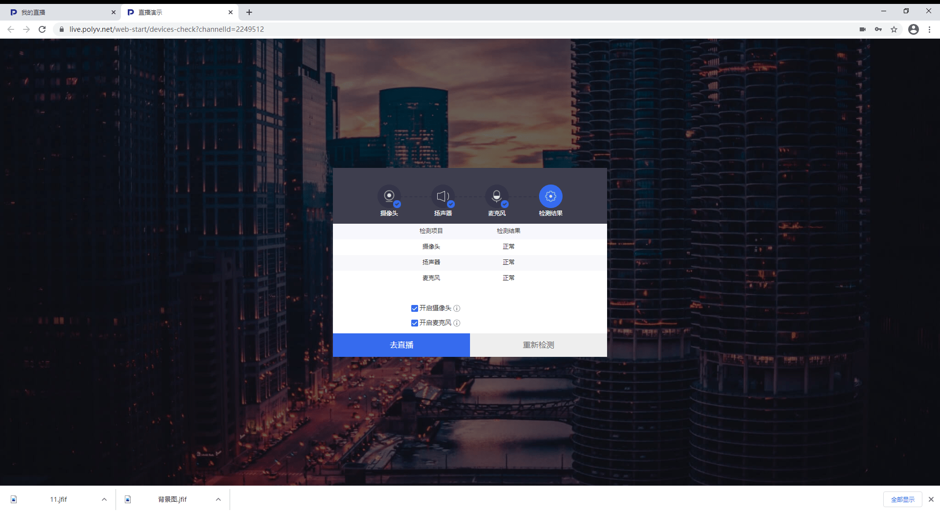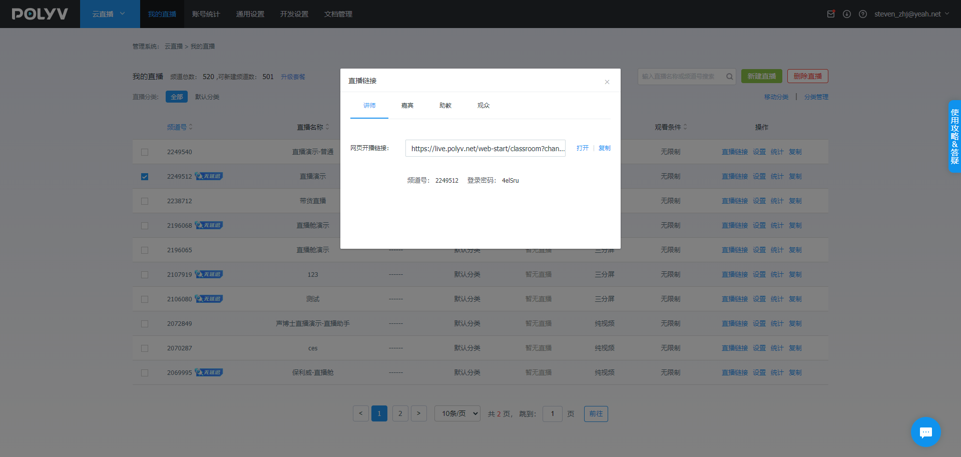 新建直播后会为用户生成一个直播间网页链接以及直播间的频道号和登录密码。输入密码登录后会自动检测摄像头、扬声器、麦克风对否正常。