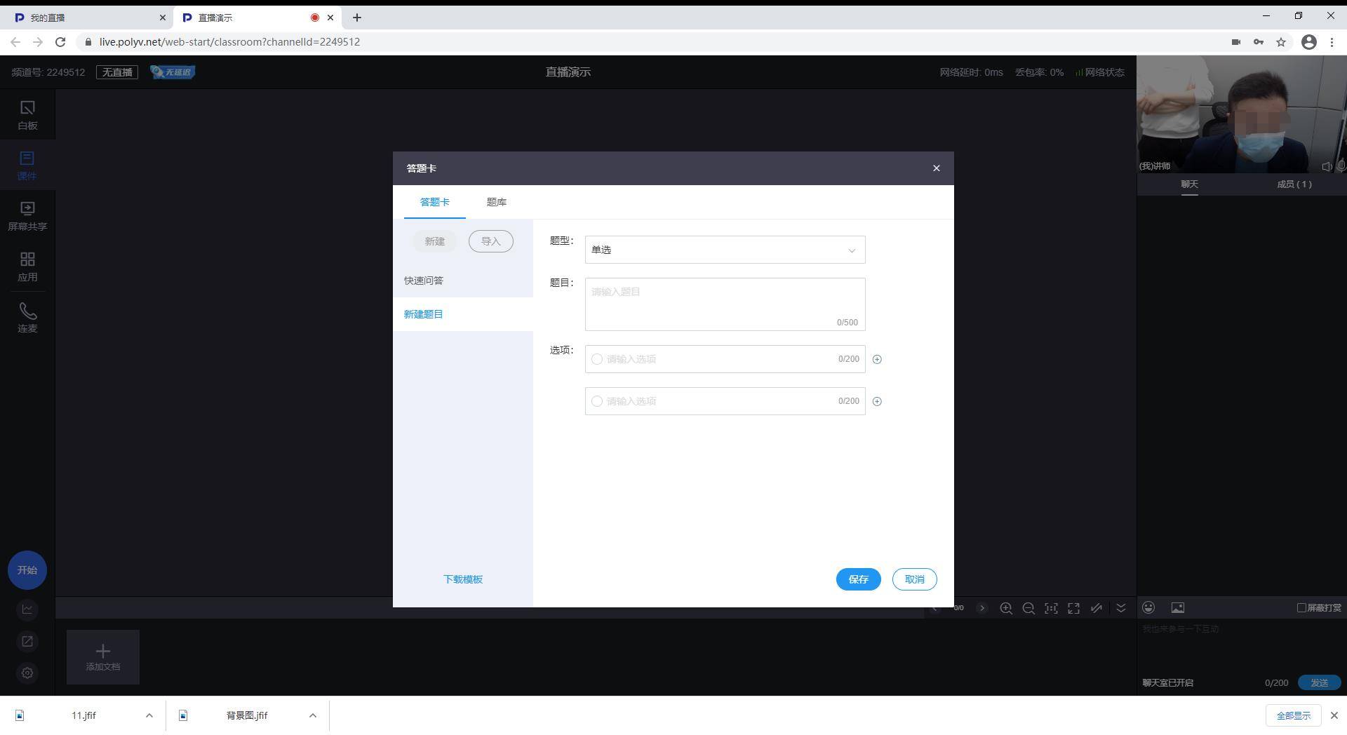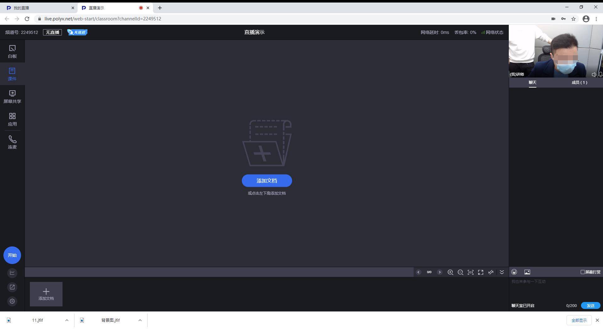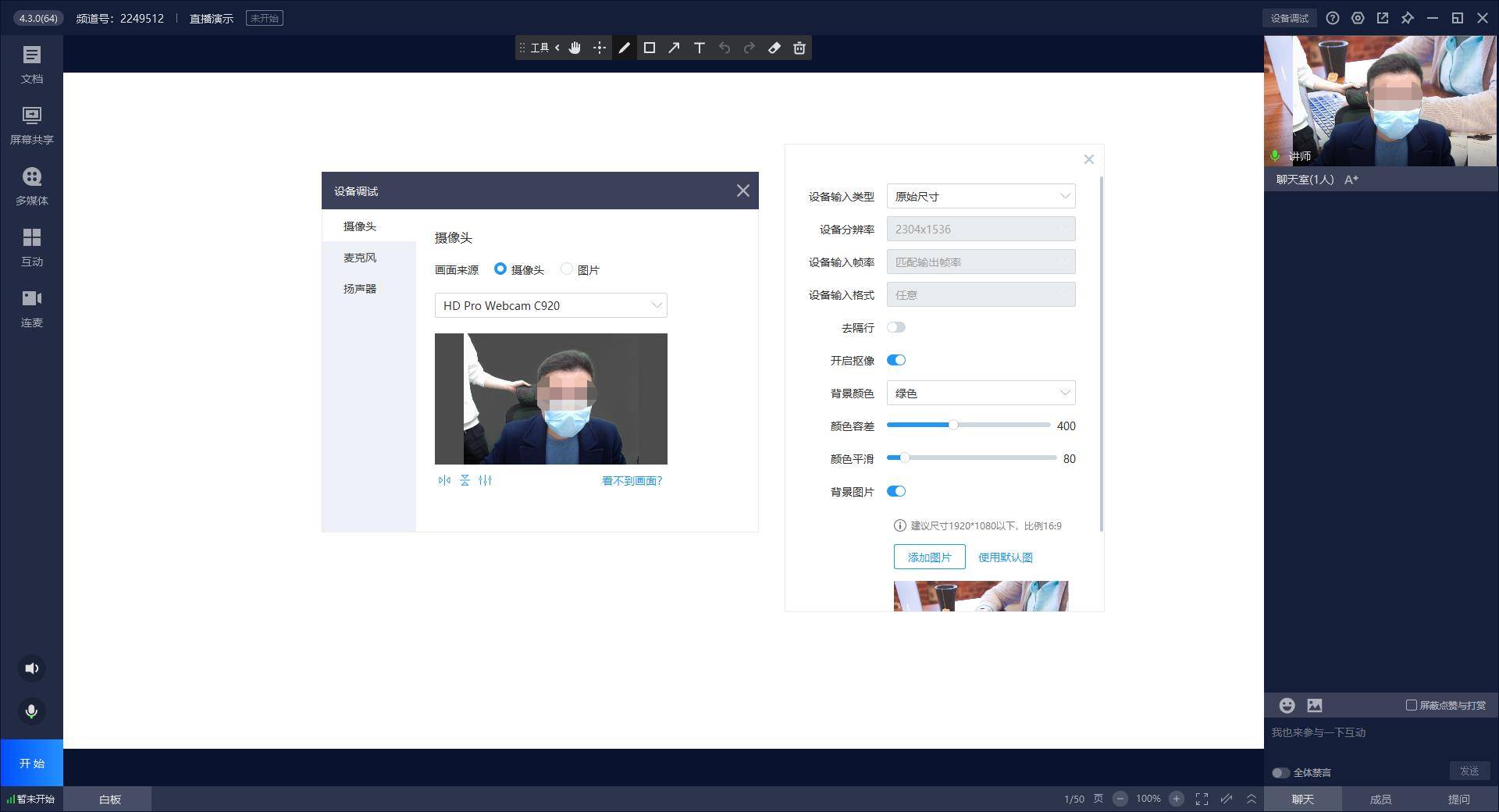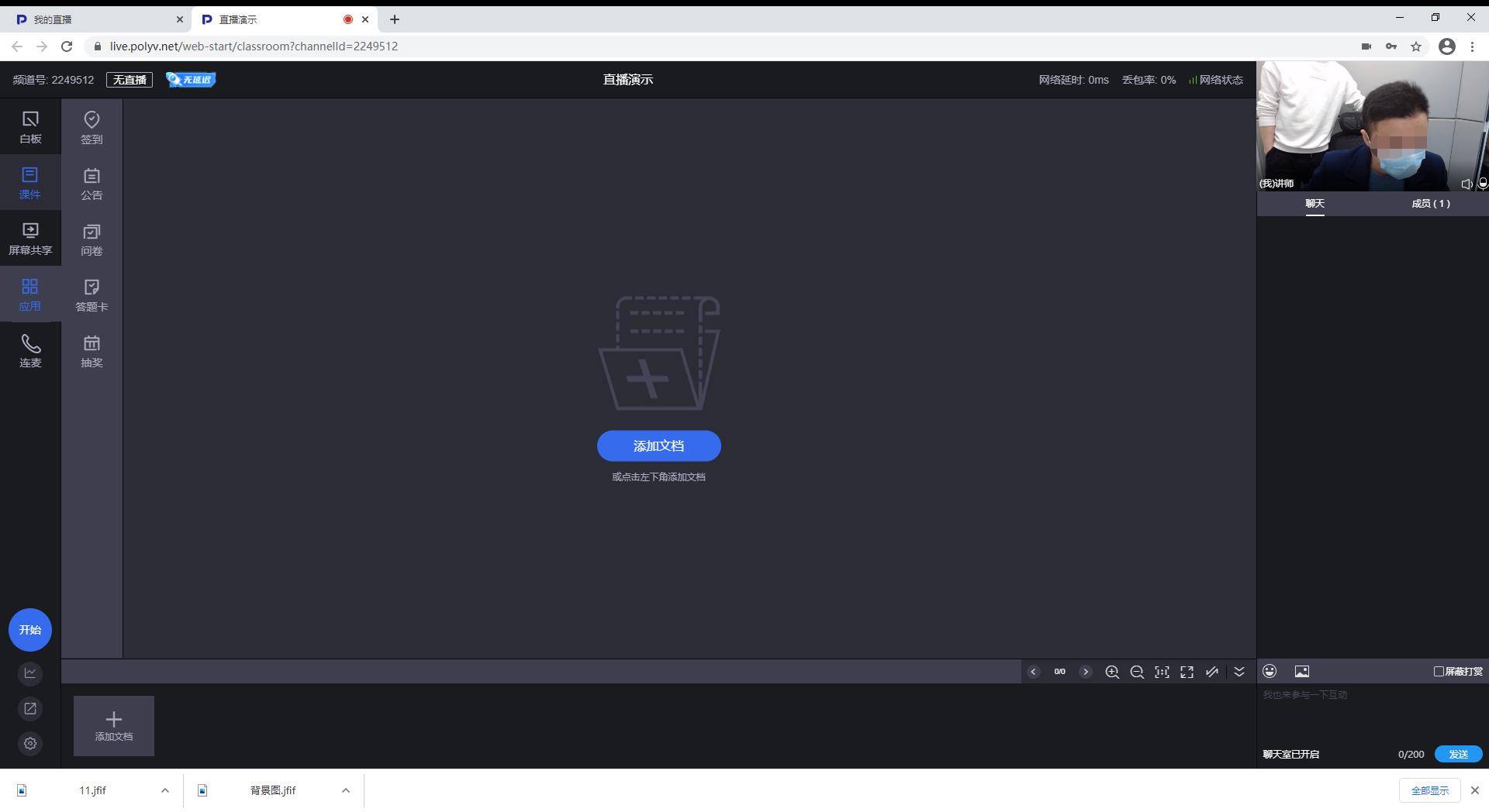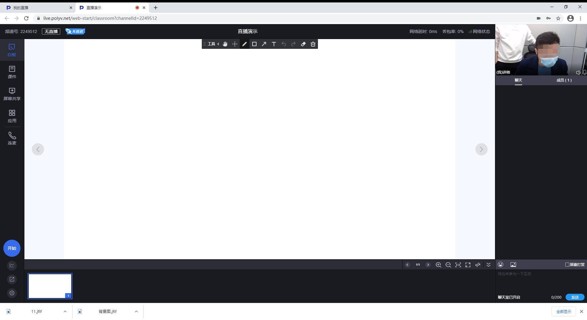 直播页面各种功能按键一目了然,可以在白板页面直接手写直播,也可以添加课件、开启聊天室、连麦,还可以通过设置签到、公告、问卷、答题卡、抽奖一些列应用加强与直播间用户之间的实时互动,提升直播效果。