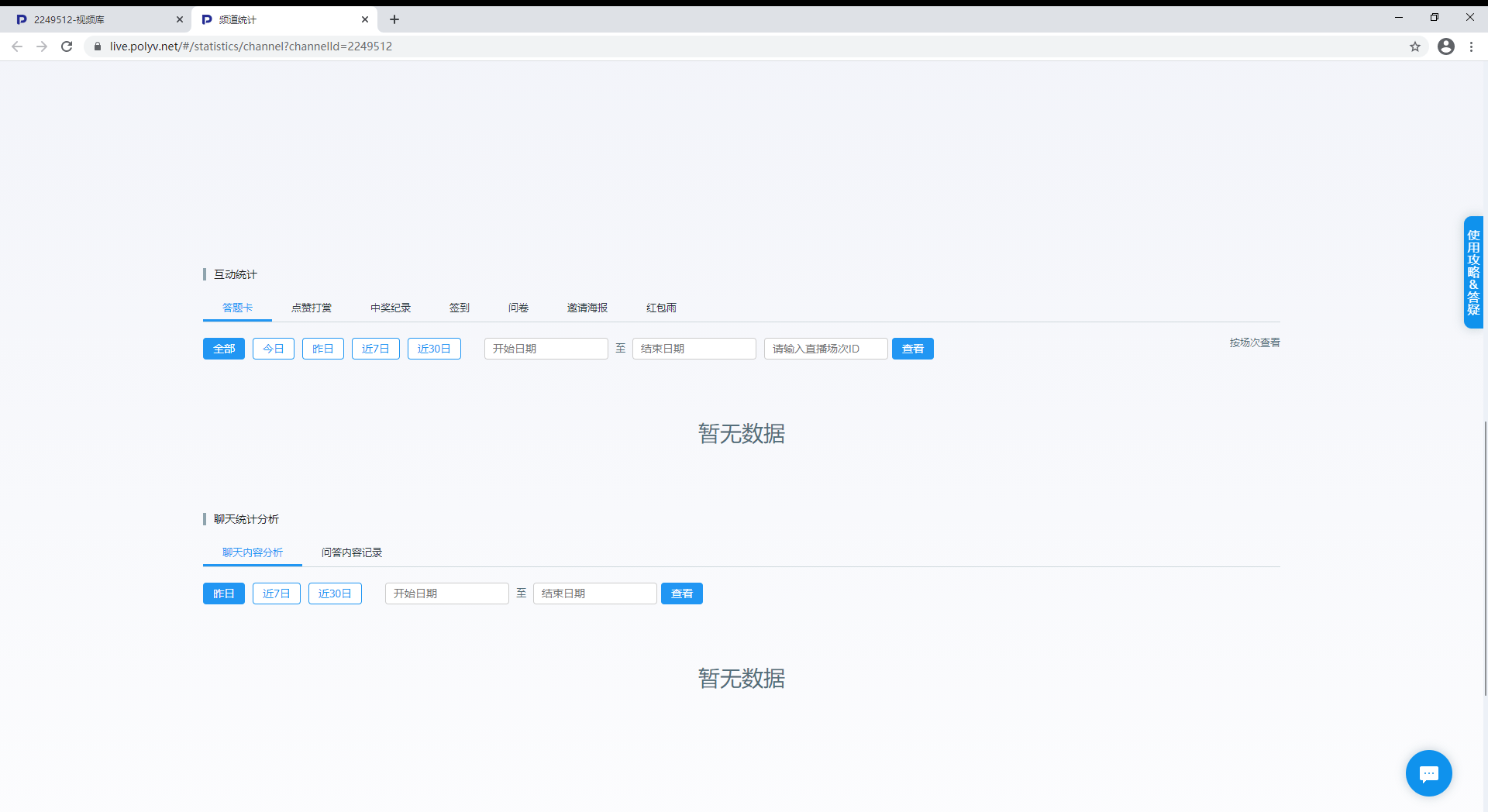 数据追踪:直播舱标配强大的数据统计功能,通过保利威专属直播软件,从底层抓取直播数据,并在仪表盘中将数据实时可视化呈现,实时在线用户分析、热度分析、使用终端分析、观看行为分析、培训互动分析等,图表形式一目了然;直播结束后也支持后台数据导出,内容包括数据统计、观看行为统计、互动分析统计、聊天统计分析、直播数据报告等。