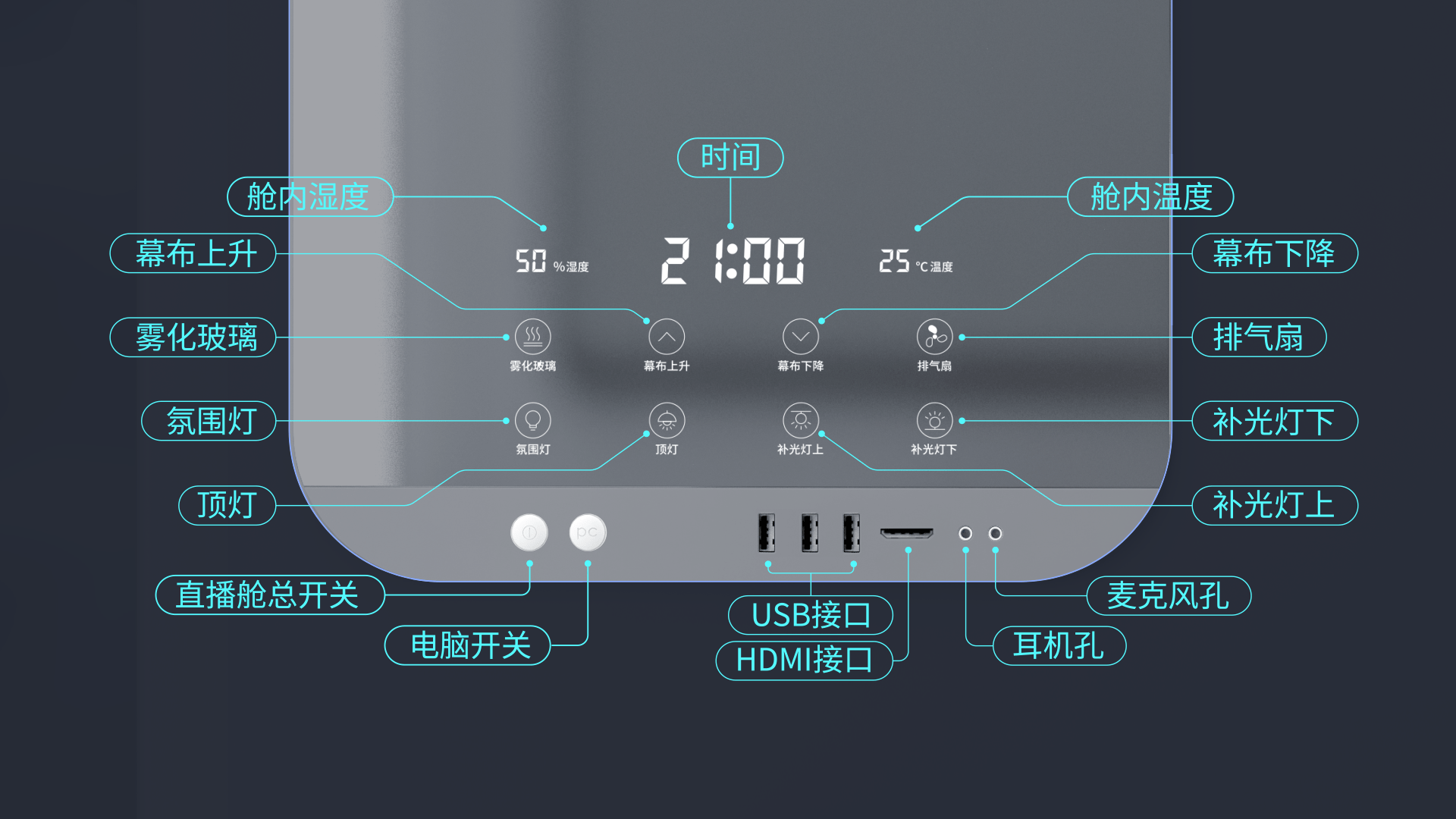 舱内左侧壁上安装有智能中控台,即实时显示时间、舱内温度、湿度,也可以让用户一键调节灯光照明效果、幕布升降、排气、玻璃雾化。中控台还集成了直播舱总开关、电脑总开关,还提供3个USB接口以及HDMI接口、耳机和麦克风接口,方便讲师外接笔记本电脑等私人设备。