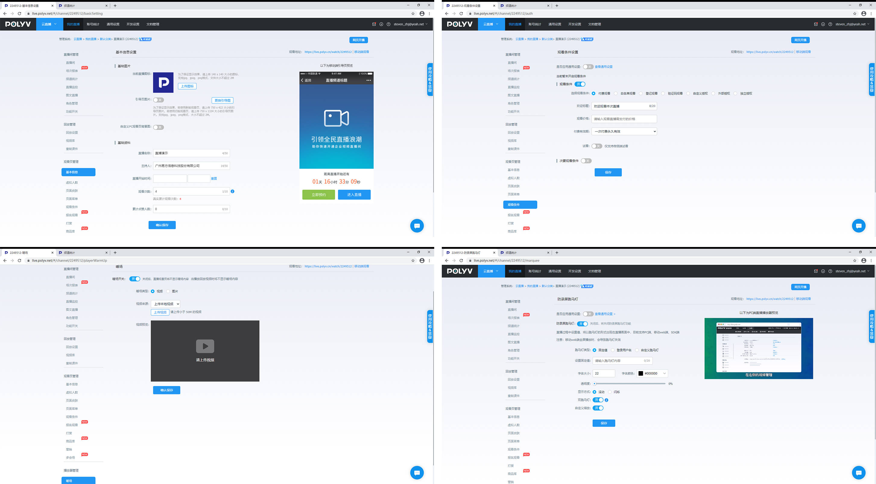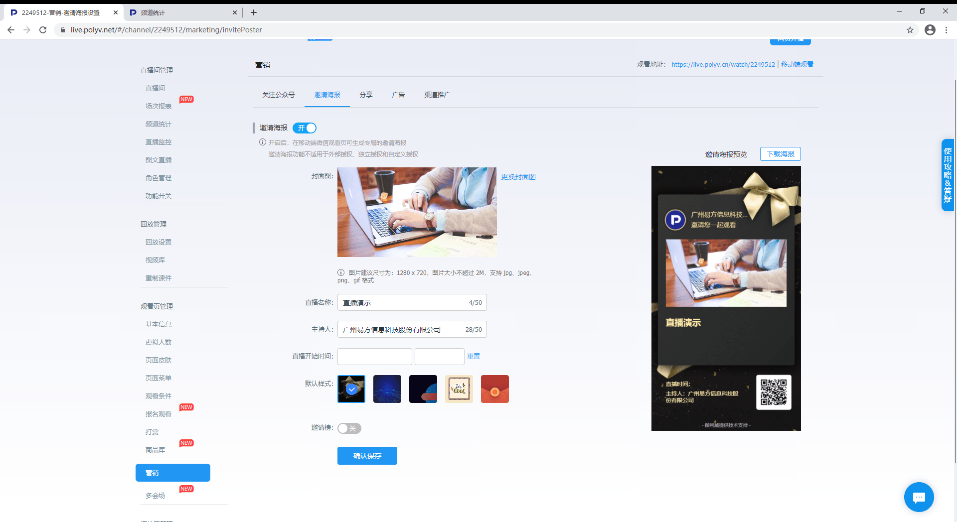 后台还可以设置各种营销推广方式包括:整合微信平台,推出微信邀请卡、企业公众号推广、关注公众号免费观看、微信分享页,同时支持无广告/自定义广告、付费观看、直播带货、边看边买等,还可以设置印有直播间二维码的邀请海报,便于直播的裂变营销。