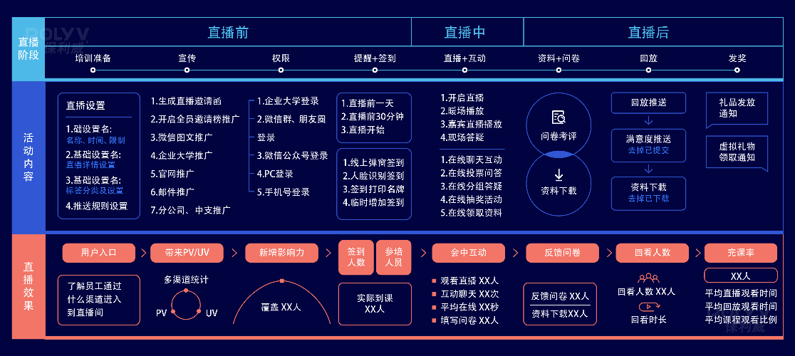 直播的专业要求非常高,保利威为用户提供专业化的直播指导与完善的售后服务。在直播指导方面,一方面,保利威为用户专业级直播培训师线上课程,从内容到互动到教学技巧,给予全面指导;另一方面,提供直播培训运营实战手册&SOP流程卡、教学直播检查清单,通过实战手册、流程卡一一对应直播前中后需要注意的操作步骤,将直播流程标准化。