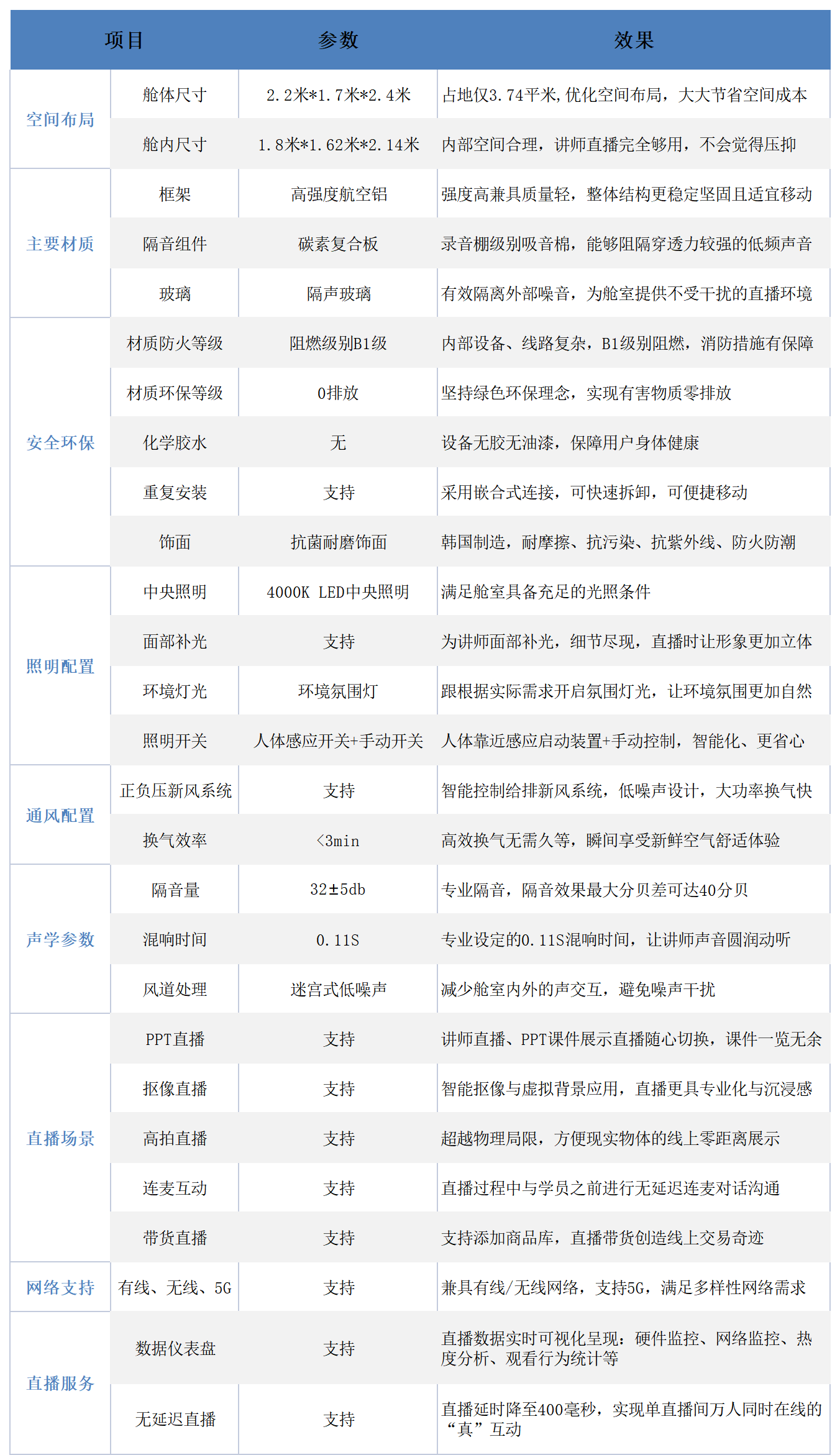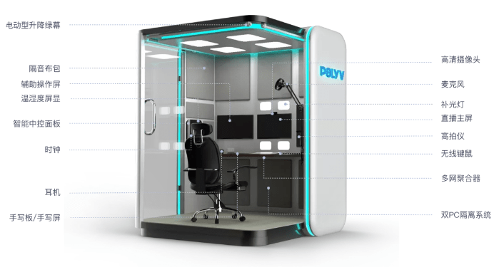 舱室顶部配备4000K自然光色温LED中央照明系统,150Lsx光照可根据需要调节亮度;舱室正对讲师的地方配备面部补光灯,可让讲师在直播时形象更加立体。